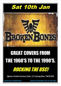 • Date TBC – BROKEN BONES – 3-piece rock band includes Smiffy from legendary London rock band Bad II The Bone. Classic rock anthems and heavy rock hits such as: Highway to Hell /Ace of Spades /Born to be Wild /Paranoid / Smoke on the Water.