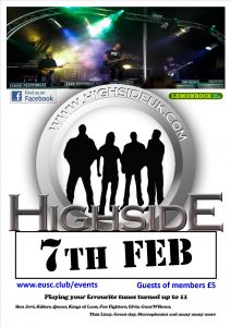 – HIGHSIDE – the ultimate covers band playing popular music turned up to 11! Highside perform the best new music and rock classics geared towards creating an electric atmosphere. Playing covers from bands such as Bon Jovi, Foo Fighters, Queen, Kings of Leon, The Killers, Elvis, Green Day, Thin Lizzy, Stereophonics and Guns ‘N’ Roses to name but a few. Guests of members £5 on the door.