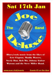 • Date TBC – JOE DELUXE – They promise soulful rhythms and an electrifying performance. Blues/rock music from the likes of Eric Clapton, Muddy Waters, Steely Dan, Keb Mo, Johnny Guitar Watson and the Steve Miller Band. Guests of members £5 on the door.