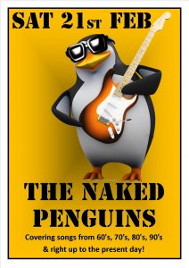 • Date TBC – THE NAKED PENGUINS – a great band playing covers from the 1960s, 70s, 80s, 90s and naughties. This 4-piece band includes a sax player. Guests of members £5 on the door.