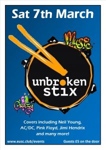 07 MAR 2026 – UNBROKEN STIX – Wraysbury based Unbroken Stix play Hendrix, Pink Floyd, AC/DC, Neil Young and many more classic rock tunes.